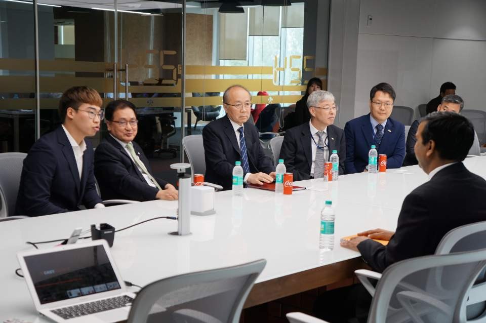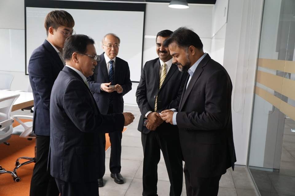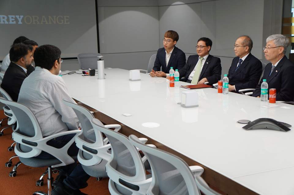 (사진2) 뉴델리 현지에 과학기술정보 통신부 유영민 장관님께서 인공지능 개발하는 회사를 방문시 회사 총 책임자와 명함을 서로 교환하는 모습
