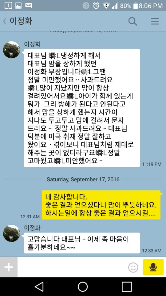 09-18 2016 가이드매니아 후기 고객님과 비즈니스를 할때 업무가 순탄하면 가장 좋겠지만 예기치 않게 서로 오해가 생기기도 합니다. 이런 곤란한 순간에도 가이드매니아는 고객님과의 소통을 통해 문제를 원만하게 해결하여 고객님께 완벽한 서비스를 제공하려고 노력하고 있습니다. 더욱더 신뢰할수 있는 가이드,통역업무를 제공하는 가이드매니아가 되겠습니다.^^
