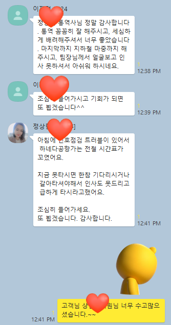통역원님께서 지하철역까지 마중 나오시고, 멀리서 오셨기에 가족처럼 꼼꼼히 챙겨주신 점에 고객님께서 남겨주신 메세지 여기에 옮깁니다.^--^