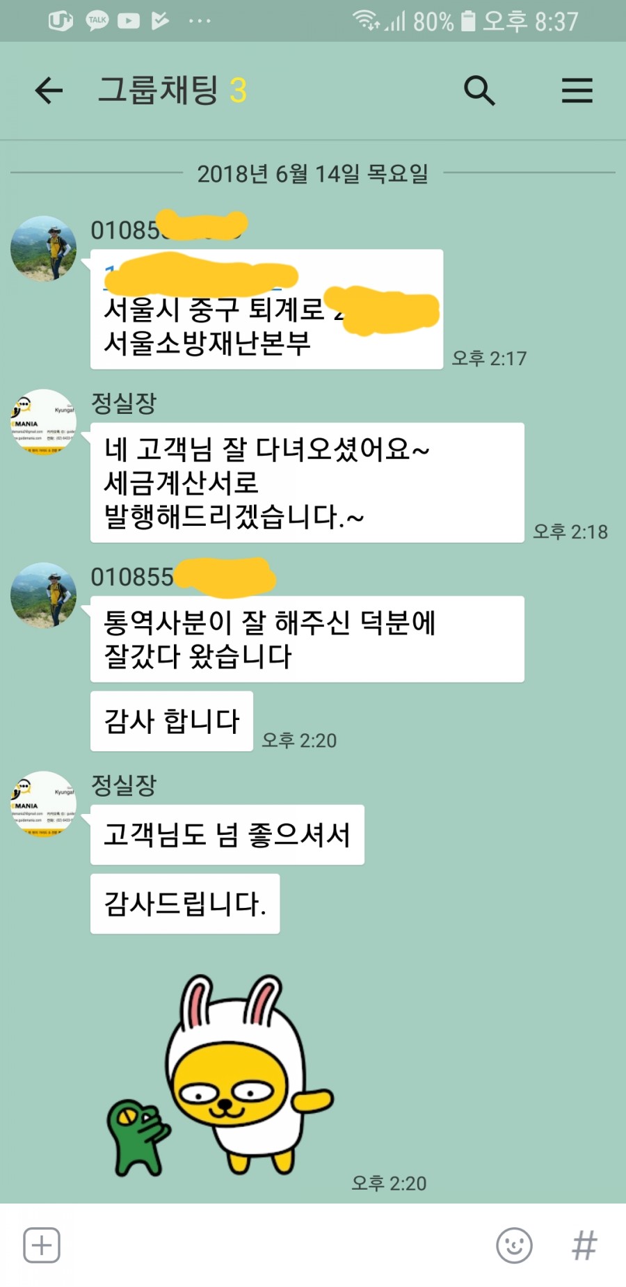 07-03 2018 고객님으로부터 온 또한번에 칭찬 톡. 4박5일로 네덜란드와 벨기에에서 고객들을 모신 다음 귀국하신후 저희에게 만족이 뜻을 표현하시므로 다시 한번 흐뭇한 감정을 갖게 해주신 서울소방재난부 고객님께 감사의 뜻을 전달해드립니다.