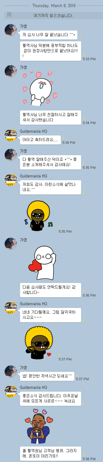 03-08 2018 GMP 합격! 다시 찾아주신다는 약속 ! 3.5~3.8 태국 지엠피 좋은 결과가 있어 저희도 너무 뿌듯하네요 ^^ 고객님 측 통역을 맡게 되어 저희도 참 훈훈했습니다. 다음에 찾아주시면 박통역관님과 같은 실력 및 인성을 갖춘 통역관님으로 잘 모시겠습니다. !