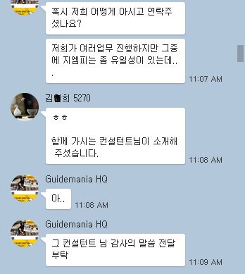 01-23 2018 컨설턴트님의 소개로 찾아주신 고객님~ 오늘 이태리에서 지엠피 통역이 필요하다고 연락를 주신 의뢰인님과의 대화입니다. 의뢰인께서 함께 가시는 컨설턴트님의 소개로 저희 가이드매니아에 연락주셨다 하네요. 의료심사통역은 의료심사 전문 가이드매니아 를 찾아주세요 ~! 최선을 다해 좋은 결과 가지실수 있도록 도와드리겠습니다.