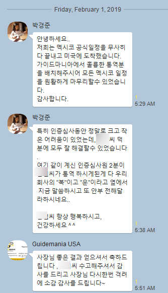 이번 1월 멕시코 공장 인증심사를 위해 저희 가이드매니아 통해서 이통역원님의 통역 서비스를 이용하신 고객님의 평입니다.