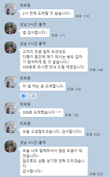 01-04 2023 만족도 높은 피드백 22년 11월 경기도 성남시 서울에 계시는 저희 팀원 최보원님께서 비즈미팅 통역을 잘 수행해주셨습니다 고객께서 다시 찾아주시겠다고 약속하셨 고요 ^^ 가격은 합리적 대신 콸리티는 최대한 높히는것을 목적삼아 고객들을 케어하고있습니다 항시 높은 만족도를 유지할수있게 2023년에도 최선을 다할것을 약속드리겠습니다 !!!!