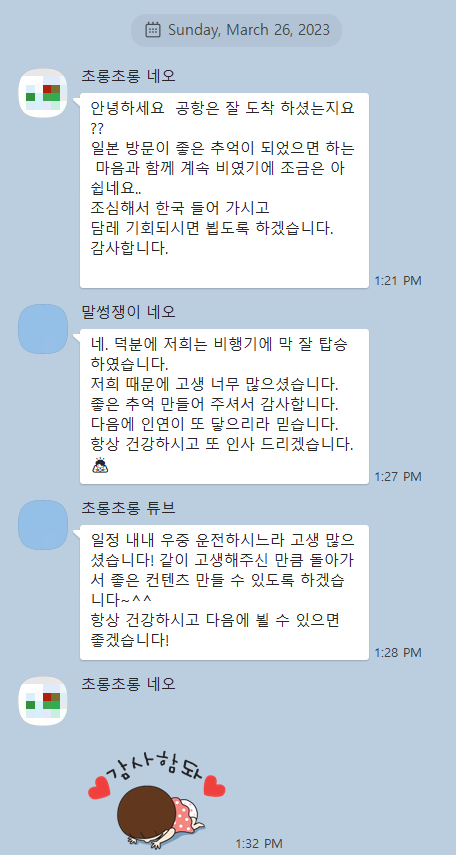 03-26 2023 LG 일본촬영끝난후 감사의 뜻 전달 23년 3월 3박4일로 동경에서 홍보물촬영하신 감독님께서 무사히 일정을 마치시고 현지코디 린나님과 감사의 뜻이 오고가며 훈훈한 작별인사를 하셨습니다 항시 고객만족을 우선으로 하는 가이드매니아가 되기를 힘쓰겠습니다. *꾸벅*